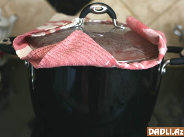 Qazanın üstünü əvvəlcə çay dəsmalı ilə örtün, onun üstündən isə qapağını qoyun.