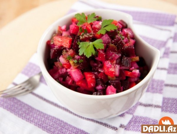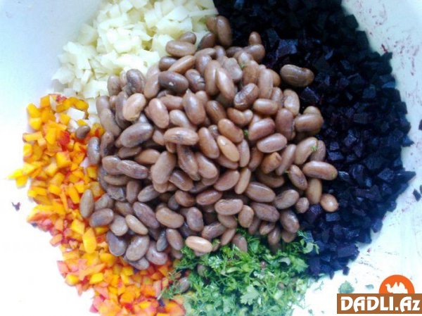 5. Kök, kartof və çuğundur qaynadıqdan sonra onları sudan çıxarırıq, qabıqdan təmizləyirik və doğrayırıq. Qeyd: Lobya iri olduğuna görə kartofu, kökü və çuğunduru çox xırda doğramaq lazım deyil.