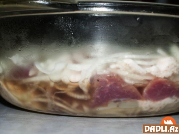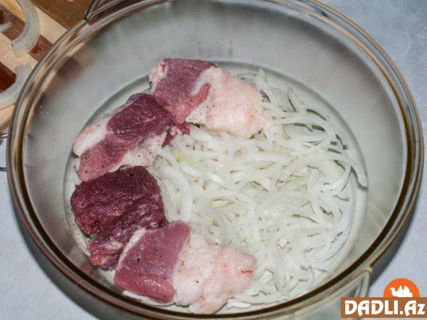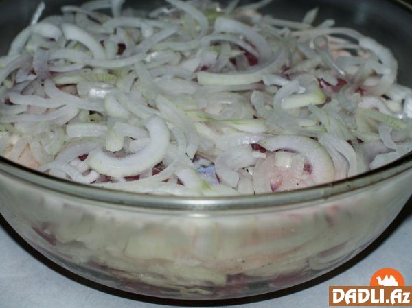 3. Ətin üzərindən daha bir lay doğranmış soğan düzülür.