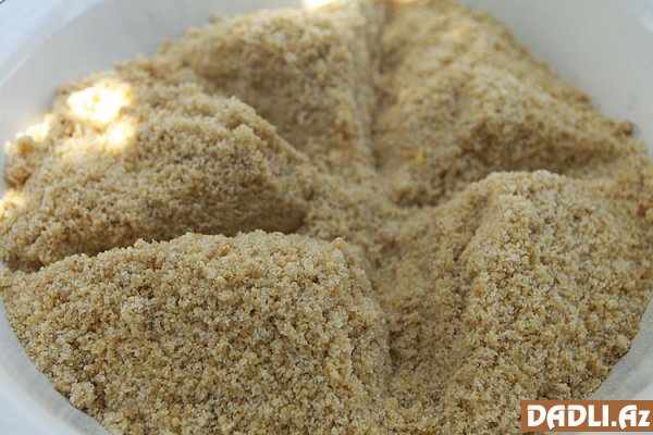 Təmizlənmiş qozu maşından keçirib şəkər tozu və hillə qarışdırın.