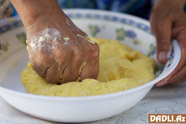 Xəmir üçün olan ərzaqları qarışdırıb xəmir yoğurun. Üzərinə nəm dəsmal çəkib təxminən yarım saat saxlayın.