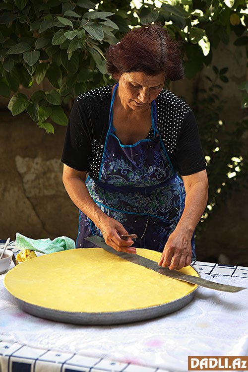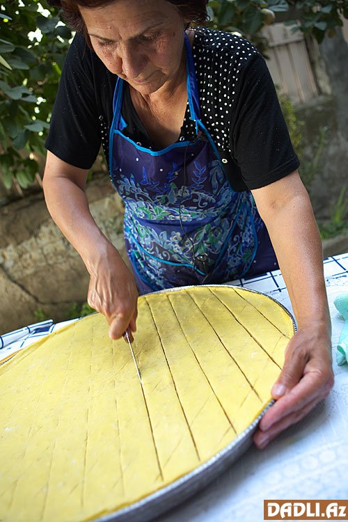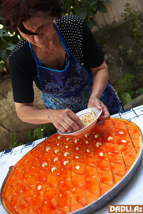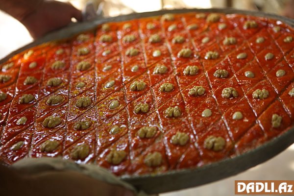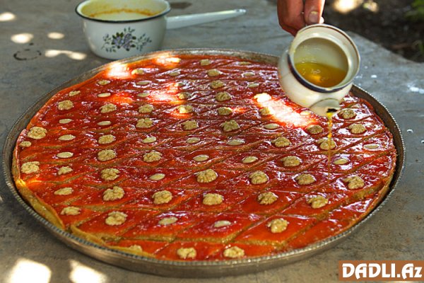 Bir müddət sonra paxlavanın ətri yayılır, deməli, üzərinə ərinmiş yağ gəzdirmək lazımdır ki, layları yaxşıca qızarıb bişsin. Bıçaqla kənarından qaldırıb paxlavanın rəngini yoxlayın.