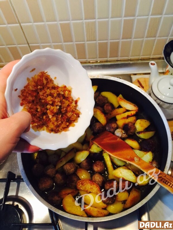 Yaxsica qarışdırılır və xırda küftəcikler duzəldilir. Sonra tavada bol kərə yağında 4 ədəd soğan xırda dogranıb qovrulur.