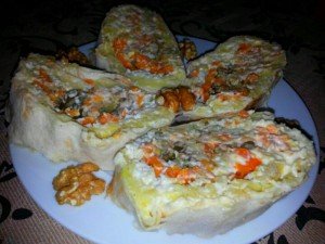 Tərəvəzlər və yumurtaları bişirib təmizləyirik, balığı xırda doğrayırıq. Lavaşların arasına mayonez səpib üst-üstə qoyuruq. Növbə ilə tərəvəzləri, yumurtanı sürtgəcdən keçirib hər birinin arasına duz, istiot, mayonez vururuq. üzərinə qoz ləpəsi və balığı da səliqə ilə əlavə edirik. Salatımızı ehtiyyatla rulon formasında bükürük. Folqanın içərisində soyuducuya qoyuruq. 2 saatdan sonra dilimlərə bölüb süfrəyə veririk.