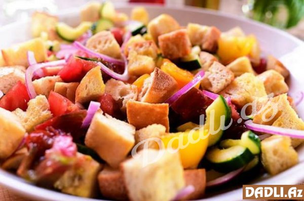 2. Xıyarı yarımhalqa, pomidorları uzunsov dilimlərlə, qırmızı soğanı isə nazik halqa formasında doğrayın. İri qabda tərəvəzləri və çörəkləri qarışdırın.