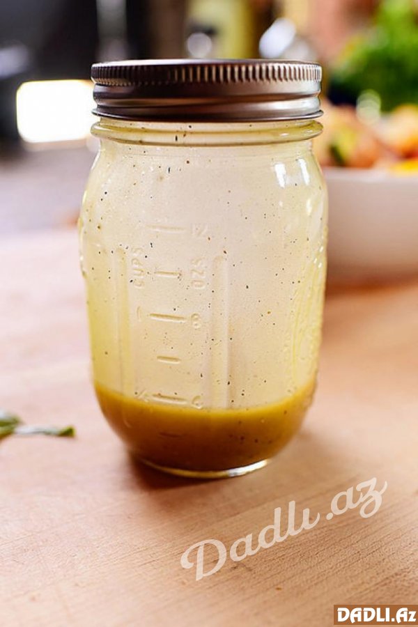 3. Kiçik qabda sirkə, zeytun yağı, duz və istiotu qarışdırın və salatın üzərinə qəzdirin. Sonda xırda doğranmış göy reyhan və nazik parmezan dilimlərini əlavə edin.