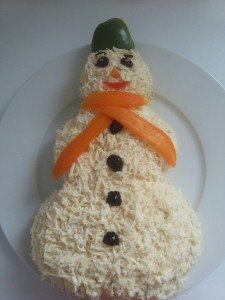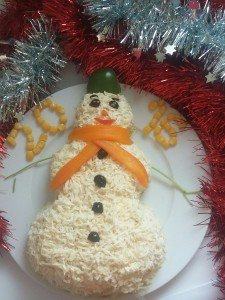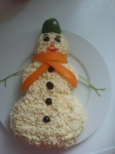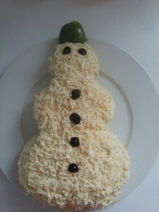 Mimozanı hazırlamaq üçün bişmiş kartof, yumurtanın sarısı, yerkökünü növbə ilə sürkgəcdən keçirib arasına duz, istiot və mayonez səpin. Sonra didilmiş döş əti, xırda doğranmış turşu xiyar və rəndələnmiş holland pendirini eyni qaydada salatın üzərinə düzün. Salatı bıçaq və əlinizlə qar adam formasına gətirin. Daha sonra yumurtanın ağını sürtgəcin xırda gözündən keçirib salatın üzərini onunla örtün. Göz, qaş və düymələri konservləşdirilmiş zeytunla düzəldin. Pomidorla qar adamın ağzını, yerkökü ilə burun və şərfini hazırlayıb yapışdırın. Fantaziyanızı işə salıb başqa tərəvəz və meyvələrdən bəzək kimi istifadə edə bilərsiniz.