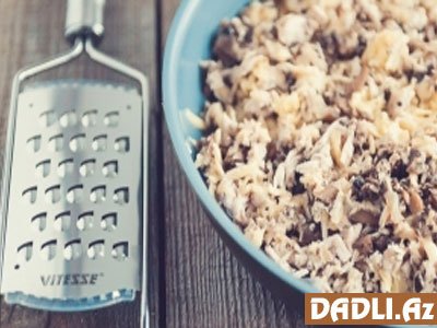 Göbələk doğranır və qızardılır, pendir də sürtkəcdən keçirilib qarışdırılır. Duz vurulur.