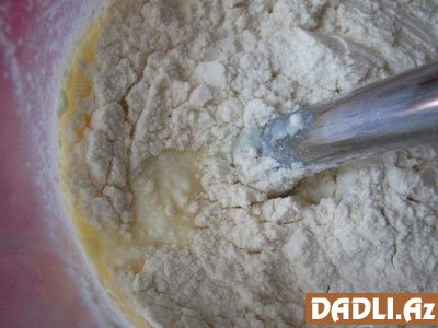 Yumurtanı şəkər tozu ilə birlikdə çalın. Sonra isə üzərinə yağla kəsmiyi əlavə edib yenidən qarışdırın.