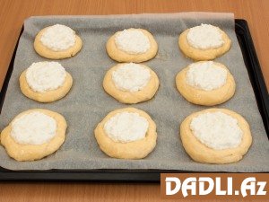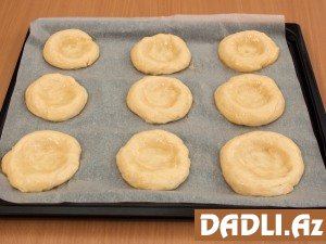 Sinini yağlayıb içinə perqament döşəyin. Xəmirdən kündələr tutub yastılayın, siniyə düzün.