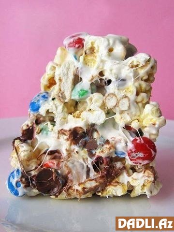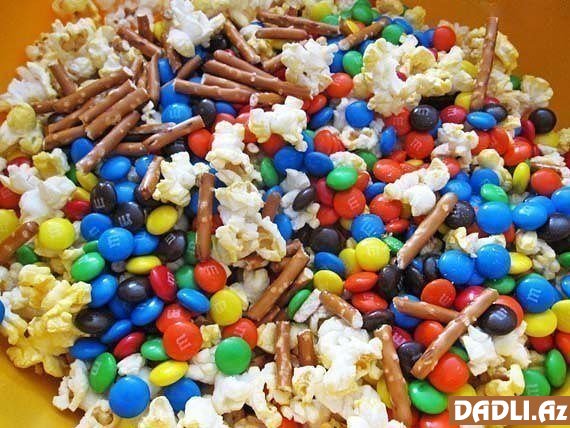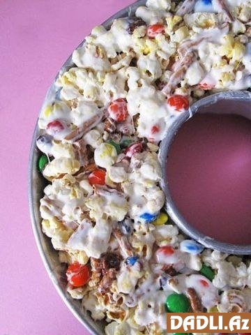 Ocaqdan götürüb popkorn, M&M’s və duzlu çöplərin qarışığının üstünə tökün, qarışdırın.