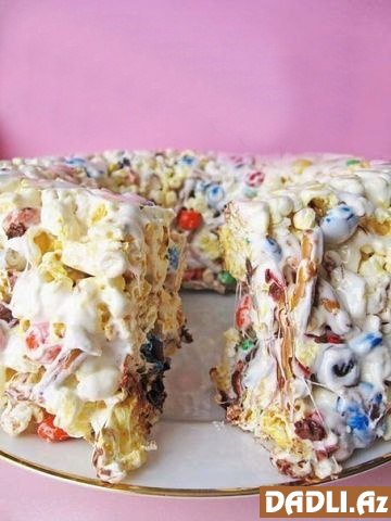 Duzlu çöplər, popkorn, M&M’s, marşmellou - uşaqların istənilən xörəyi uğruna rədd edəcəkləri şirniyyat və çərəzlərdir. "Ziyandır" deyib çox zaman onları bu sadaladıqlarımızdan məhrum etsək də, ildə bir dəfə, öz bayramları zamanı qarışdırıb festival kimi rəngbərəng bir tortla sevindirmək olar. Ad günləri üçün də yarayar. Sevinəcəklərinə əmin olun.