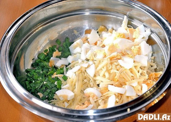 Pendiri sürtgəcdən keçirin, yaxud xırda doğrayın, xırda doğranmış göy soğan və kubik doğranmış bişmiş yumurta ilə qarışdırın. İç hazırdır.