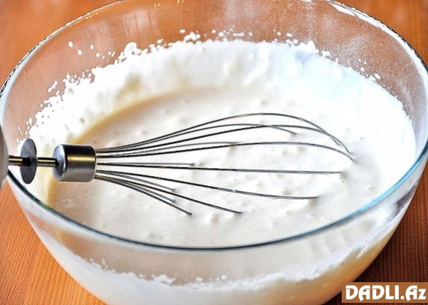 Yumurtaları, duz-istiot, 1 çay qaşığı da şəkər tozu əlavə edin. Qabartma tozunu ən sonda əlavə edin, qarışdırın. Xəmir duru alınmalıdır.