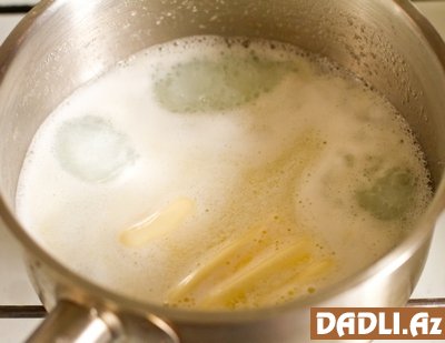 Qazana su tökün, duz, şəkər tozu, xırda doğranmış kərə yağı əlavə edin. Ocağın üstə qoyun, yağ əriyənədək bişirin.