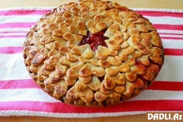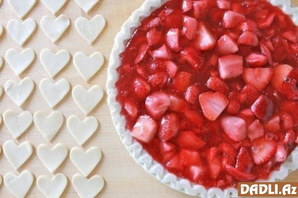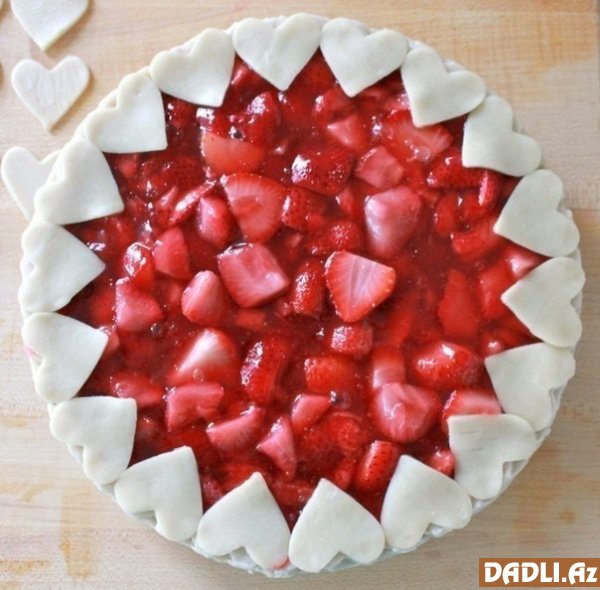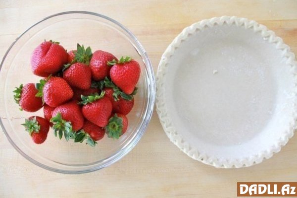 İç: çiyələkləri ölçüsünə görə iki və ya dörd yerə bölün, şəkər tozuyla qarışdırın. Nişastanı suyla qarışdırıb ocağın üstünə qoyun, çiyələyi əlavə edin, qaynayıb qatılaşandan sonra götürüb soyudun, formadakı xəmirin üstünə tökün.