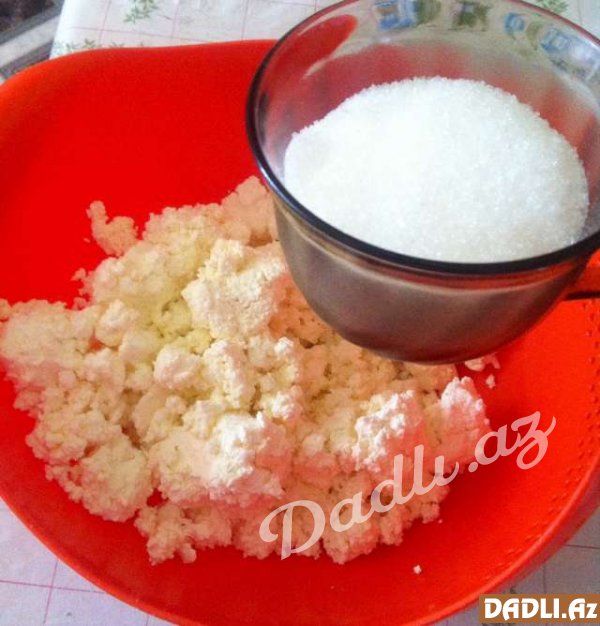 Kəsmiyə, şəkər, vanil qatıb yavaş-yavaş qarışdırırıq (kəsmik əzilməsin)